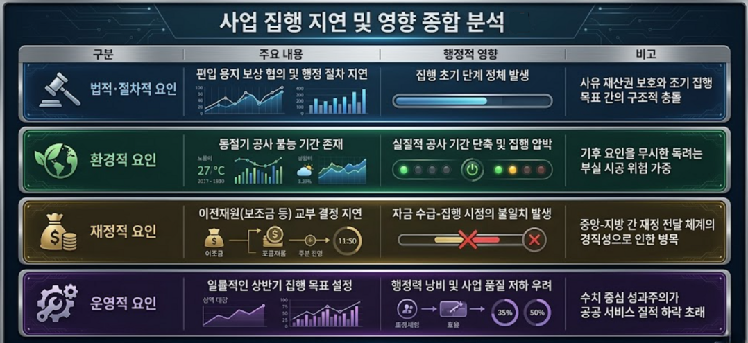 또한, 원자재 가격 급등으로 인한 설계 변경이나 계약 금액 조정 절차가 진행 중일 때는 집행이 일시 중지될 수밖에 없다. 이러한 민간 시장의 변동성을 고려하지 않은 채 집행 수치만을 강조하는 방식은 행정과 민간의 피로도만 가중시킨다는 비판이 제기된다.
