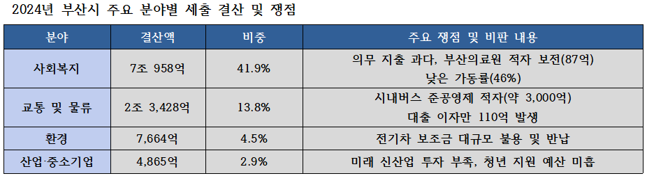 법적 의무 지출인 복지비와 구조적 적자를 메우기 위한 교통 보조금이 눈덩이처럼 불어나면서 정작 부산의 미래 먹거리를 위한 산업·경제 분야 투자는 뒷전으로 밀려나고 있다는 지적이다. 예결신문이 부산시의 '2024회계연도 결산서'와 '시의회 예산결산특별위원회 회의록'을 분석해 비대해진 복지·교통 예산의 그늘과 재정 효율성의 현주소를 파헤쳤다.