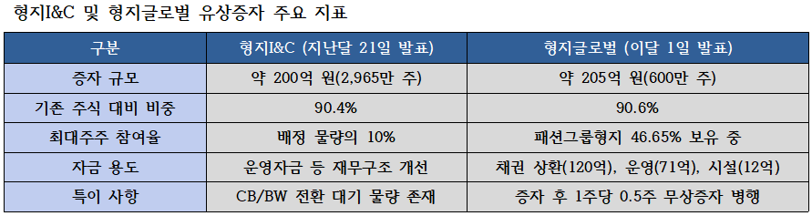 지난달 21일 형지I&C가 발표한 200억원 규모의 유상증자는 말 그대로 '기습적'이었다. 발행 신주(2965만 주)가 기존 주식 수의 90.4%에 달하는 역대급 물량이었다. 주식 수가 두 배 가까이 늘어남에 따라 기존 주주들이 보유한 지분 가치는 산술적으로 반토막이 날 수밖에 없는 상황이다.