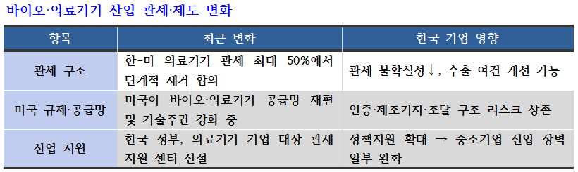 미국은 중국과의 경쟁 심화로 '중국 외 조달처' 확보를 강조하고 있어 한국의 바이오·의료기기 산업은 원료·시약·키트 등 바이오 제조의 기초부문에서 기회를 맞을 수 있다.
