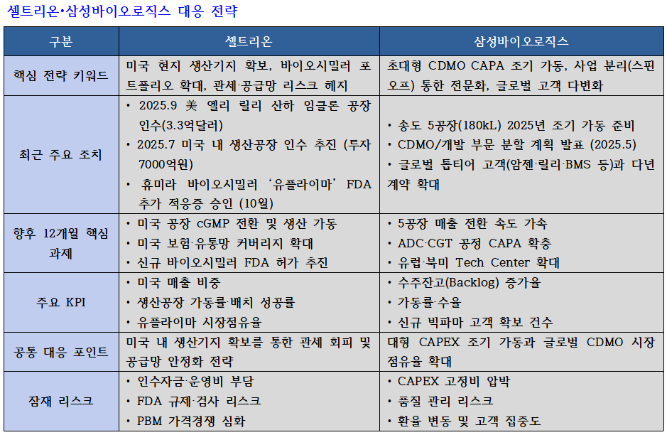 이에 삼성바이오로직스나 셀트리온 같은 기업들은 ▲초대형 CAPA 조기 가동 ▲CDMO·개발 부문 스핀오프 ▲신규 공정 확장 ▲글로벌 거점 고도화 ▲미국 생산기지 확보⸱포트폴리오 강화 ▲현지 상업화 체계 등에 너서고 있다.